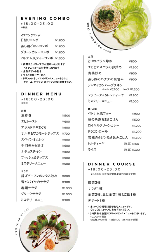 | 営業時間 | 12:00~24:00 フードラストオーダー23:00 ドリンクラストオーダー23:30 |